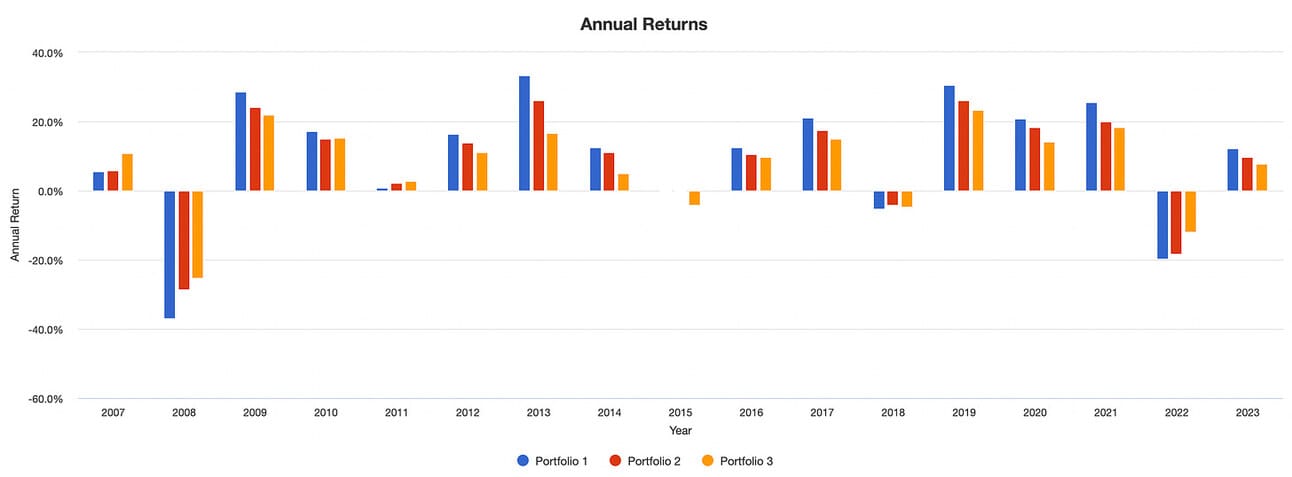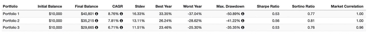 To play this out, I created three portfolios in Portfolio Visualizer.