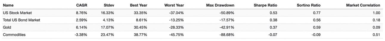 You can check out the risk/return profile of stocks, bond, gold and commodities over the past 15+ years in the graphic below.